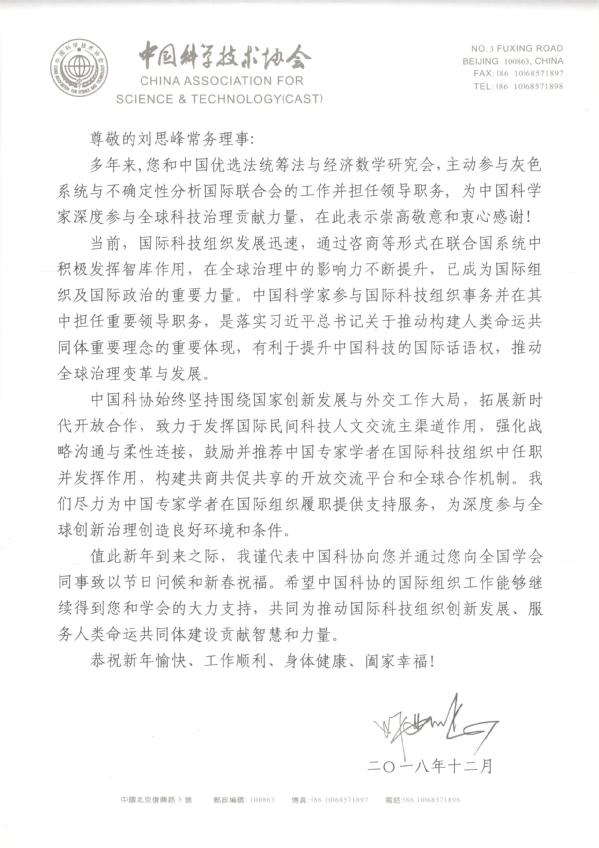 刘思峰教授收到怀进鹏主席来信后随即向经管学院灰色系统研究所的师生以及中国优选法统筹法与经济数学研究所灰色系统专业委员会的全体会员、灰色系统与不确定性分析国际联合会的部分会员转达了怀进鹏主席的关怀和问候。刘老师认为:怀进鹏主席来信对我国乃至世界各国从事灰色系统与不确定性分析研究的学者无疑是巨大的鼓舞,必将对灰色系统理论的发展和传播起到不可估量的推动作用!希望通过长期持续的辛勤工作,把中国本土原创的灰色系统理论火种撒向全世界。