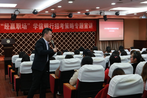银行是经管学生毕业后的主要就业方向,为了提高学生的行业认知,提升就业竞争力,3月12日晚上,学院邀请江苏省高校招生就业指导服务中心下属的学信学院教学研究院副院长梅高翔来永利官网开展了主题为“2020届毕业生银行招考策略”的宣讲会。
