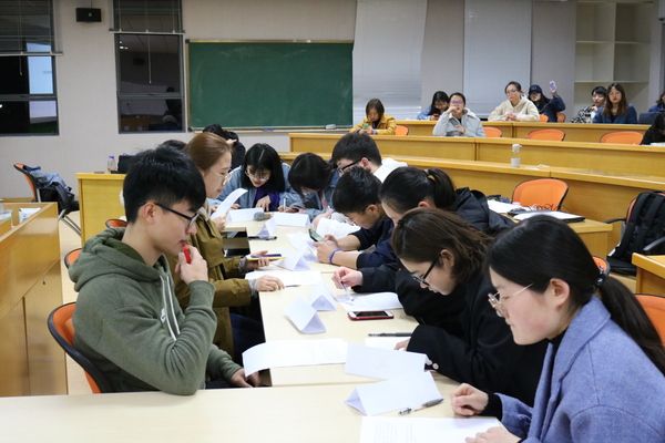 讲座开始前,随机抽选了20名在场学生分为两组进行了无领导小组讨论的模拟面试,模拟结束后,陈俊根据同学们在面试过程中暴露出的问题进行了分析讲解,并指导学生根据自己的性格特征选择合适的小组角色。随后,陈俊老师正式开始了今天的讲座,他首先给大家讲解了自我介绍的要点以及沟通表达的注意事项,重点强调了要在10-15秒的时间内突出自己的闪光点。最后,陈俊就面试常见问题给大家提供了借鉴模板,并建议学生从“职位的要求、我的优势、我与职位的契合程度”三个层面把握回答的要点。