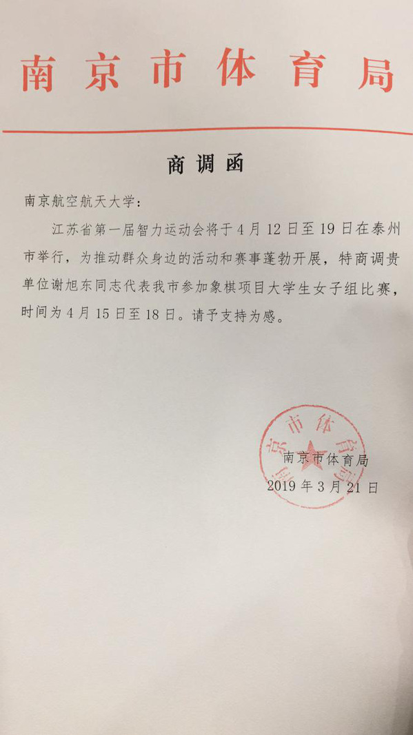 4月15日至4月18日,江苏省第一届智力运动会中国象棋比赛在泰州举行,共有270名运动员、教练员和裁判员等参与此赛事。永利官网谢旭东同学作为我校唯一一名代表参加了本次赛事,并以三胜二和的不败战绩取得了江苏省第一届智力运动会中国象棋大学生女子冠军,为南京市摘得一枚宝贵的金牌。