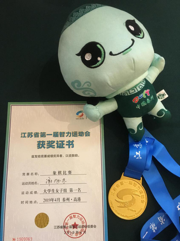 4月12日下午,江苏省第一届智力运动会在泰州开幕。江苏省第一届智力运动会组委会名誉主任、江苏副省长陈星莺,省第一届智力运动会组委会主任、省体育局局长陈刚等出席开幕式。经济与管理学院2018级研究生谢旭东同学该赛事中国象棋大学生女子冠军,为南京市摘得一枚宝贵的金牌。