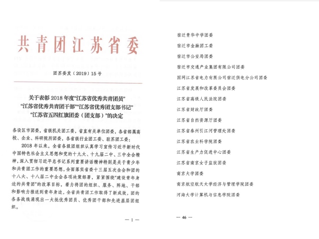 近日,共青团江苏省委发文表彰2018年度五四红旗团委、五四红旗团支部、优秀共青团员、优秀共青团干部。永利官网团委荣获“江苏省五四红旗团委”荣誉称号。