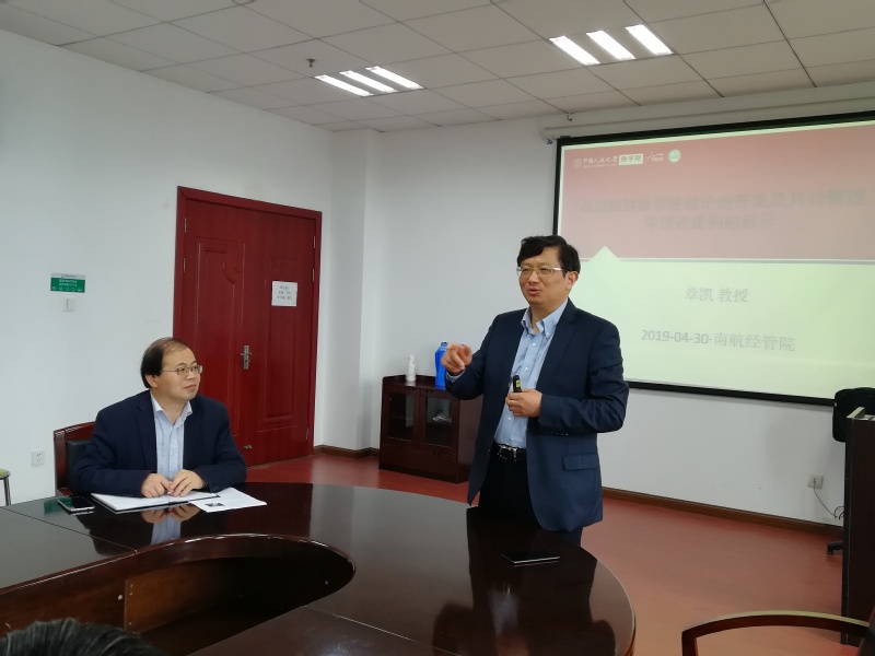 2019年4月30日上午,中国人民大学商学院章凯教授应永利官网人力资源管理研究所的邀请,在学院702会议室作了题为“自组织目标系统理论的开发及其对管理学理论建构的启示”的学术报告。报告由胡恩华教授主持,东南大学经济管理学院的吕鸿江教授、yl23455永利官网经济与管理学院的张龙教授、王凌云副教授等老师和研究生参加了本次学术讲座。