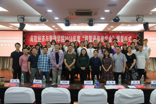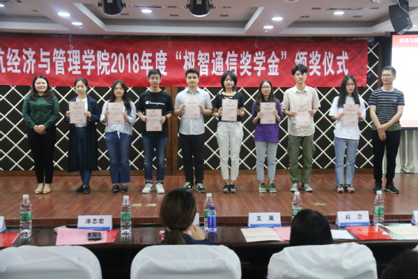 5月27日晚上,经济与管理学院2018年度“极智通信奖学金”颁奖仪式在经管楼A0305报告厅举行。极智通信科技股份有限公司财务总监沈桂英、技术总监金国华、市场总监刘念、研发总监吴春明,经管学院副院长王英、党委副书记涂志宏、管工系教师王涛、团委书记庞依达以及全体获奖学生出席了本次颁奖仪式。