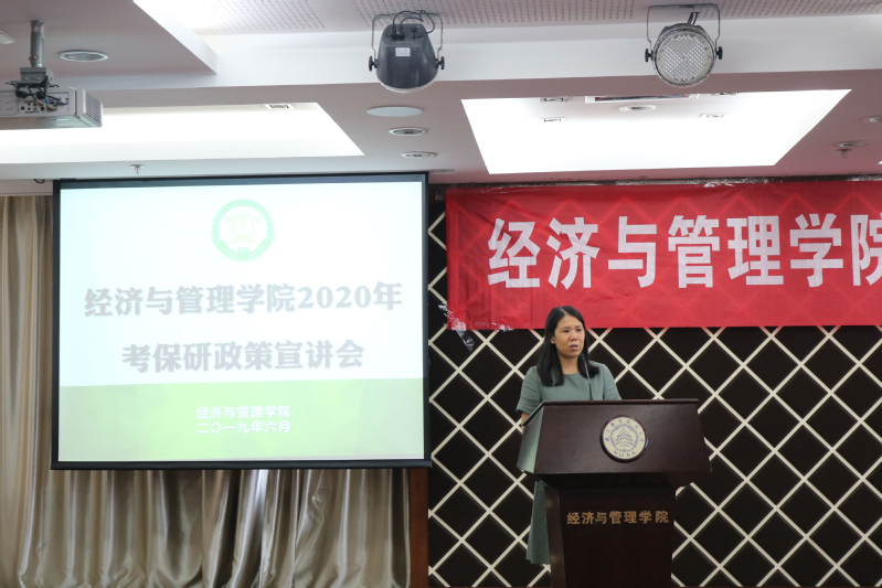 为了帮助2020届毕业生了解永利官网研究生招生政策,合理规划考研、保研,6月24日,经济与管理学院在A0305报告厅举行2020届考保研政策宣讲会。经管学院副院长王英、管工系系主任马静、工商系系主任谢嗣胜、经济系系主任袁潮清、各学科建设负责人、系所骨干教师、辅导员及百余名2016级学生参加了本次活动。