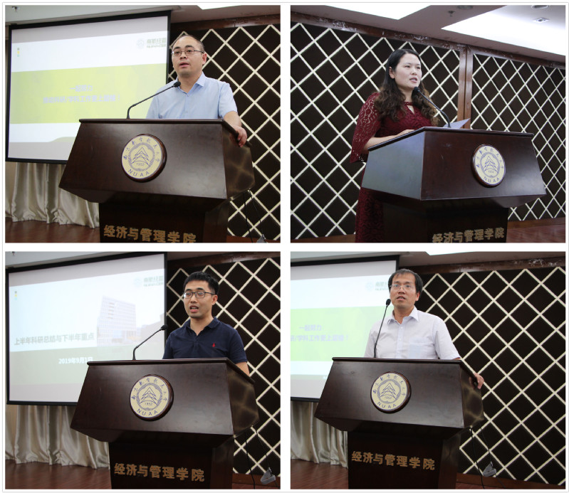 院长周德群充分肯定了学院上半年在师资引聘、教学科研、学科建设、学生工作、学术交流、学院文化建设等几个方面所取得的可喜成绩。周德群强调全院教职工要始终不忘教书育人的初心,牢记立德树人的教师使命,坚持问题导向,对照目标找差距,突出重点抓落实,要充分认识学科与专业建设的突出重要性和现实紧迫性,以立德树人为根本,整合院内资源,统筹校内资源,持续推进内涵式建设,周德群特别强调了营造学院良好环境与文化的重要性,鼓励广大教职工为学院的各项工作建言献策,并结合学院工作实际,从科学研究、教育教学、迎评促改等方面对2019下半年工作进行了重点部署。