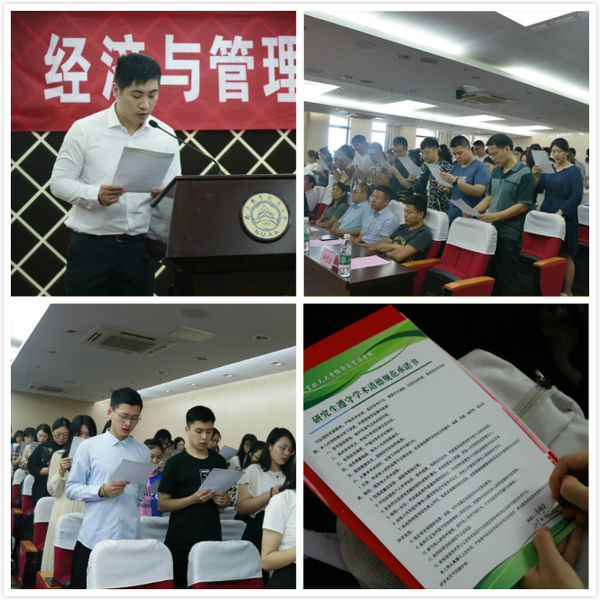同时,2019级全体研究生在学院领导和老师们的见证下签订《yl23455永利官网经济与管理学院研究生学术道德规范承诺书》,全体新生宣誓做“严格遵守有关科学研究的规定和程序,努力成为优良学术道德的传承者和良好学术风气的维护者”。