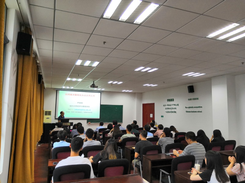 2019年9月5日上午,电子科技大学教授李登峰受学院智能决策与风险分析研究所邀请,在南航将军路校区经济与管理学院704作了题为“区间值决策优化及其应用”的讲座。学院教授朱建军、教授徐海燕、教授何沙玮等教师及部分硕、博研究生现场聆听了李登峰的报告,本次学术报告由徐海燕主持。