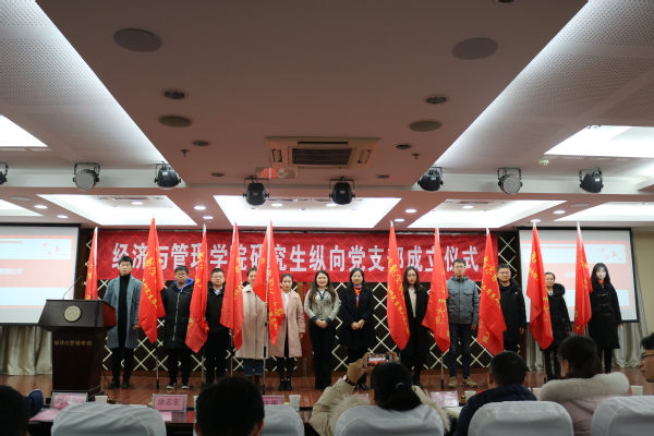 涂志宏代表学院党委宣读了《关于同意yl23455永利官网经济与管理学院研究生纵向党支部的批复》,焦宏图为新成立研究生纵向党支部授旗。