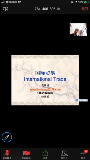 8点,经济与管理学院院长周德群在线进入18级国贸专业本科生《国际贸易原理》的线上课堂。袁潮清老师已经在zoom平台中开始了课程导论的讲解。周德群院长参加了课堂的学习并借机对该课堂的老师和同学们表示慰问和关心,鼓励大家高效利用线上教学资源,提升自主学习效率,并希望大家在多种平台使用期间,关注并反馈体验心得,为将来线上线下教学融合奠定基础。