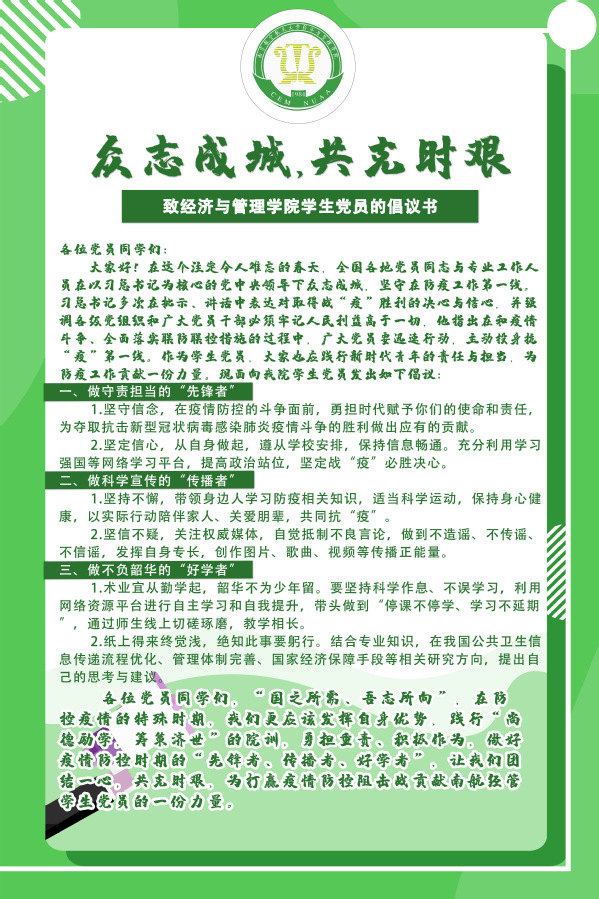 2月初,经济与管理学院学生党总支向全体学生党员发出倡议,号召全体学生党员践行“尚德励学,筹策济世”的院训,众志成城,共克时艰,为打赢疫情防控阻击战贡献南航经管学生党员的一份力量。