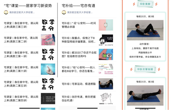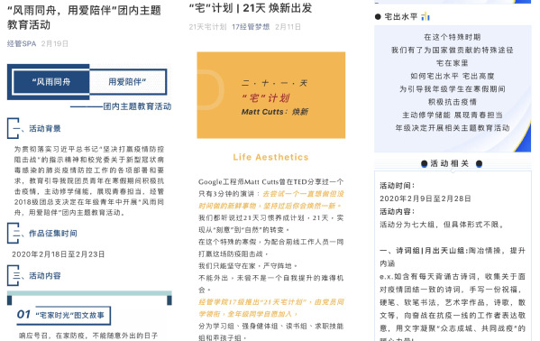 学支中心精心打造“宅”课堂,学生教员集体备课,结合教材梳理知识点,自制笔记线上录课,做好学业辅导。团学组织积极筹划,推出线上“宅补给”系列,帮助同学们居家闭关修炼技能,“宅”出新高度。