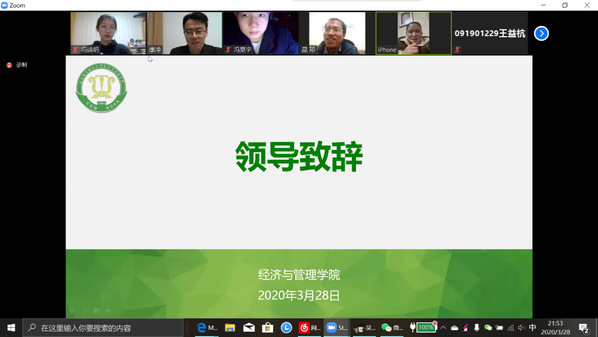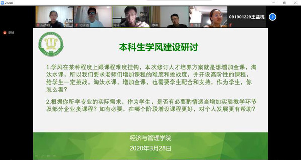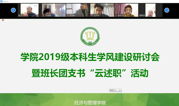 3月28日晚,经济与管理学院召开了2019级本科生学风建设研讨会暨班长团支书“云述职”会议。院党委副书记涂志宏、副院长邓晶、教学办主任田苑娜、团委书记刘小杨以及班主任代表韩梅、陆彪、肖琳、陈永洲、胡恩华、马晓平、王长波、苏飞、郝晓晴参加本次会议。会议由本科生2019级辅导员康冲主持。
