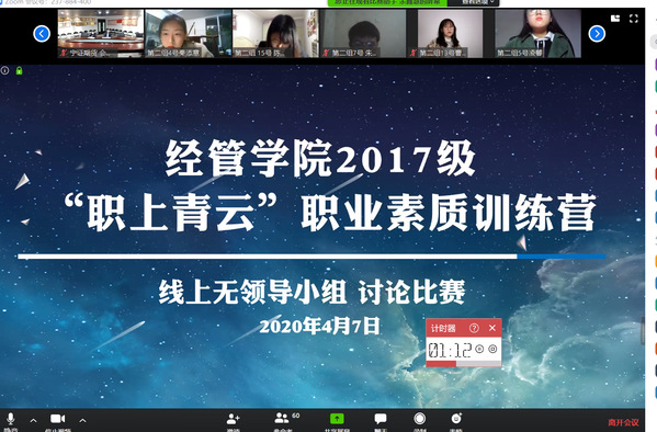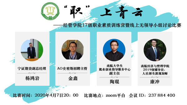 为帮助学生在疫情防控期间,树立正确择业就业观、做好生涯规划、提升求职就业能力,经济与管理学院举办“职上青云”职业素质训练营系列活动。4月7日晚,“职上青云”——无领导小组讨论比赛在zoom网络平台举办,活动吸引百余名2017级本科生参加。本次比赛邀请到宁证期货副总经理杨鸿岩、AO史密斯招聘主管金鑫、我校就业创业指导服务中心副主任陶琨、经管学院2019级辅导员康冲担任评委,对学生求职就业中的常见问题以及如何在无领导小组面试中脱颖而出进行细致讲解和精心指导。