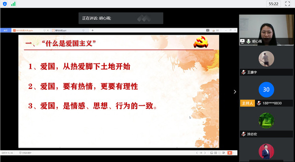 思想是行动的指引,理论是实践的路标。会议开始,党支部书记康冲领学了习近平总书记在对北京大学援鄂医疗队回信,并通过回顾十八大以来总书记对青年的历次讲话,表达了总书记对青年学子的殷切期望和谆谆嘱托。随后,17级辅导员胡心雨为大家讲授一堂爱国主义教育微党课,从历史、实践、学理等角度为大家剖析了什么是爱国主义,青年应该如何践行爱国主义,她讲到:“爱国主义,不但表现为对河山、民族、历史、文化难割难舍的依恋之情,还表现为在危难之机‘祖国如有难,我必作先锋’的担当献身精神”,引发了同学们的阵阵共鸣,加深了同学们对“爱国主义”四个字背后蕴含的深厚含义的理解。