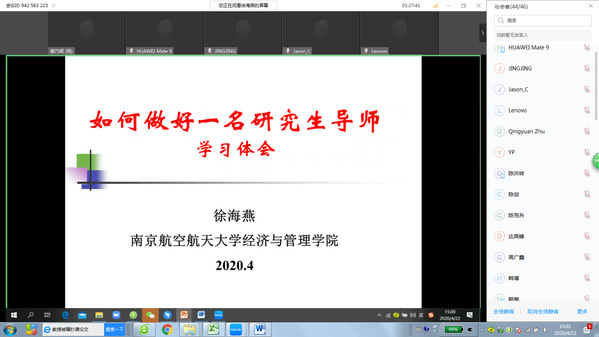 4月22日下午,经济与管理学院举办了题为“如何做好一名研究生导师”的主题讲座。为了响应学校立德树人的育人目标,养成和谐健康的导学关系,本次讲座特意邀请两位校“五好导师团队”获得者,学院特聘教授、全国优秀教师刘思峰教授及学院教授委员会主席徐海燕老师分别就研究生导师责任和导学关系建设进行分享,讲座由学院分管研究生教学副院长谢乃明主持,共40多位教师参与了线上讲座。