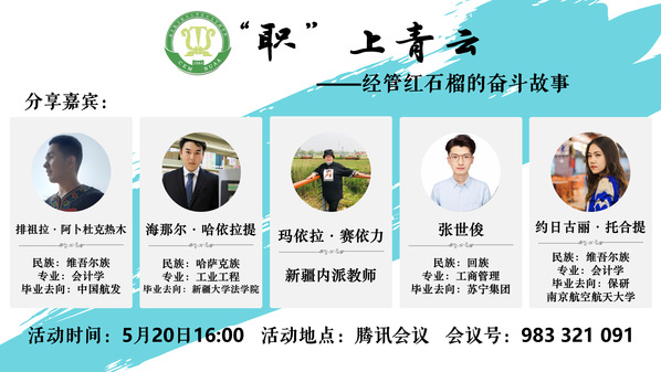 5月20日,经济与管理学院举办“‘职’上青云职业素质训练营——经管红石榴的奋斗故事”交流分享会,活动采取线上线下相结合的形式,邀请新疆内派教师玛依拉•赛依力以及16级优秀毕业生针对新疆籍少数民族学生的职业生涯规划进行专题分享, 40余名学生参与本次交流会。