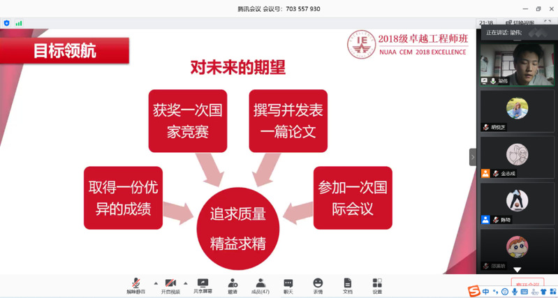 5月22日,经济与管理学院2019级卓工班动员宣讲会在线上顺利举办, IE学社骨干成员、全体2019级管理科学与工程类同学参加了此次会议。赵雪、黄雪芹、梁伟三位历任卓工班班长从建设背景、专业介绍、就业去向以及培养模式四个方面对工业工程专业做了基本介绍,宣讲了卓越工程师班的培养方案和培养要求,帮助新生提高专业认同感,引领更多新生力量选择工业工程专业,努力成为工程实践、科研创新的高素质卓越人才。