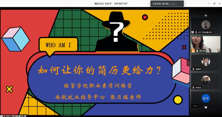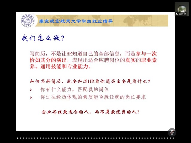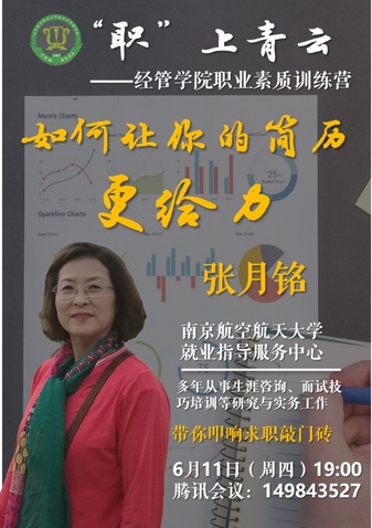为落实学校党委关于“稳就业”的相关决策部署,切实提升学生就业竞争力,6月11日晚,经济与管理学院邀请南航就业创业指导服务中心张月铭老师开展“‘职’上青云:如何让你的简历更给力”线上专题讲座,辅导员胡心雨、刘婷炜以及200余名学生参加了本次活动。