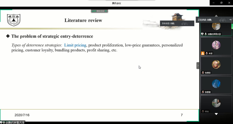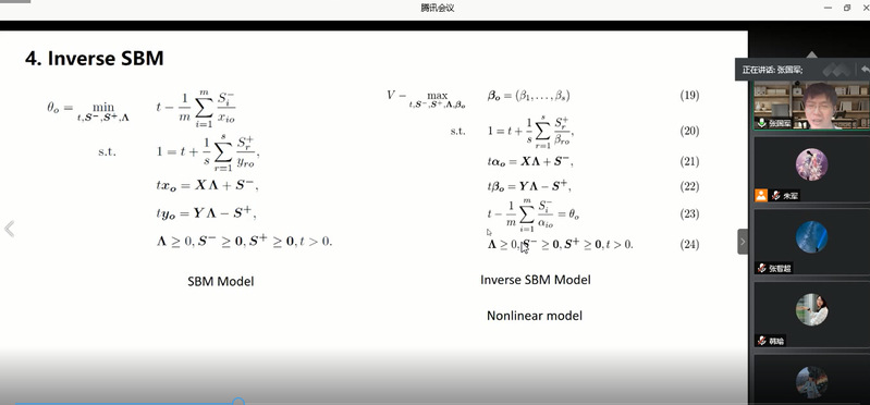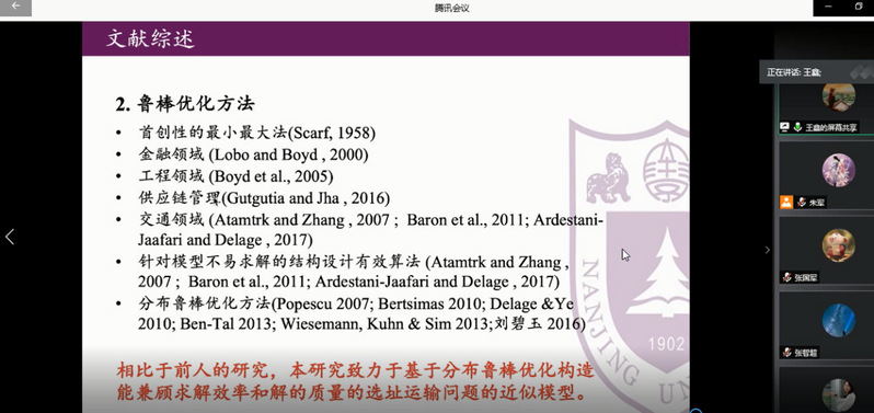7月16日下午,青年学生张国军、王鑫、徐鹏受学院智能决策与风险分析研究所邀请,在腾讯会议分别作了题为A General Inverse DEA Model for Non-radial DEA、Target-oriented Robust Location-Transportation Problem、Pricing and entry strategies for competitive firms with managerially optimistic entrant的讲座。永利官网教授徐海燕、谢乃明、朱建军等教师及部分硕、博研究生线上参加了张国军、王鑫、徐鹏的报告分享,本次学术报告由徐海燕主持。
