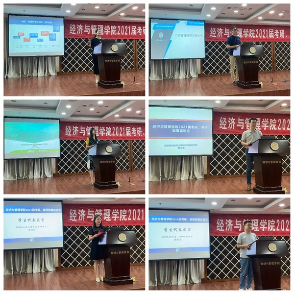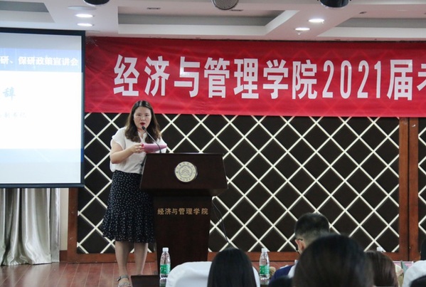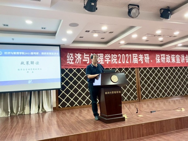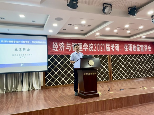 为了帮助2021届毕业生了解永利官网研究生招生政策,合理规划考研、保研目标,提升学院生源质量,8月27日,经济与管理学院在A0305报告厅开展2021届考研、保研政策宣讲会。经管学院副院长邓晶、谢乃明,党委副书记涂志宏,管工系系主任马静、副主任虞先玉,工商系副主任刘文龙,经济系副主任查冬兰,辅导员及百余名2017级学生参加了本次活动。