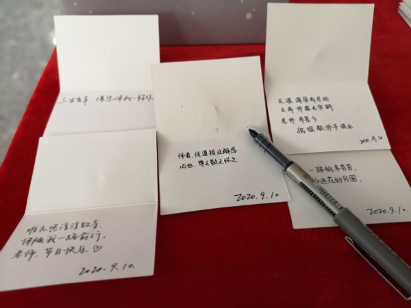 9月9日晚,经济与管理学院团委学生会的同学亲手为学院全体老师手写祝福贺卡,“一路桃李芬芳,永远花好月圆”“天涯海角有尽处,只有师恩无穷期”“老师,您辛苦了!”。行行真切小字,写下的是学生对老师无声的祝福;张张贺卡,折叠的是学生对老师道不尽的感激。