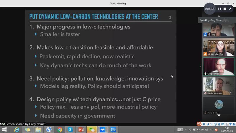 在此次学术交流活动中,Nemet首先作了题为‘Policy to address climate change with dynamic technologies’的报告。Nemet表达了对习近平总书记于2020年9月22日在联合国大会上提出的中国到2060年实现碳中和的目标的兴奋之情。在此基础上,Nemet重点介绍了动态技术变化过程以及动态技术变化系统,以及在碳中和目标实现过程中的政策需求。