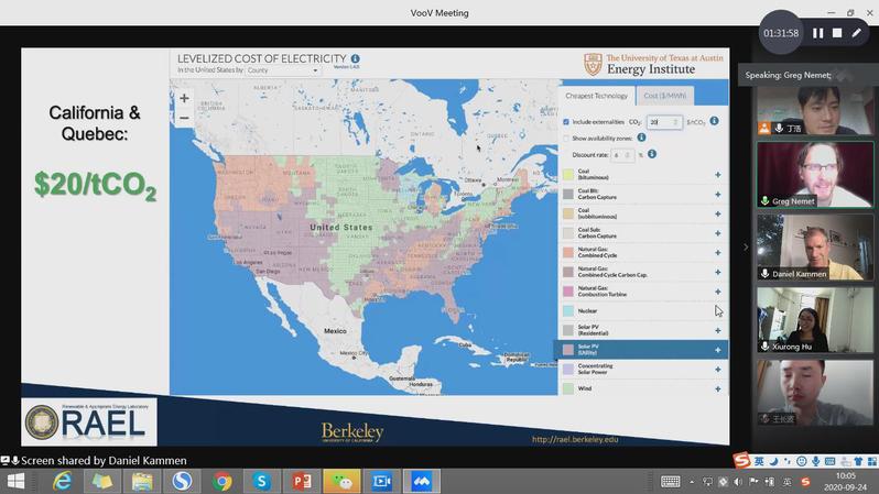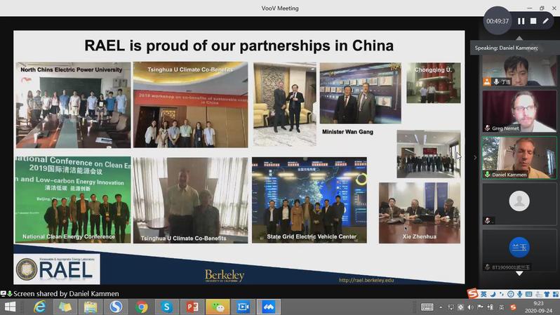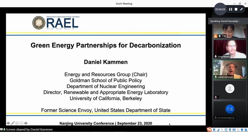 随后,Kammen作了题为‘Green Energy Partnerships for Decarbonization’的报告。Kammen同样表达了对习近平总书记提出的碳中和目标实现的信心。并从国际合作协同促进碳中和目标实现这一角度展开了介绍,重点介绍了中美等多个国家和加州等地区的气候变化目标和可再生能源发展目标。Kammen还介绍了他所创立的可再生能源实验室(RAEL)与中国多个学校和部门开展的合作交流。