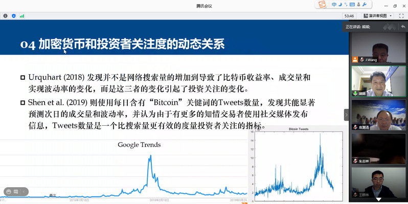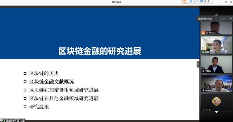 10月12日,天津大学教授熊熊应学院金融研究所邀请,在线为我校师生作了题为“区块链金融研究进展”的精彩学术讲座。本次讲座由金融研究所所长王建立主持。经济与管理学院副院长王群伟、教授袁潮清、朱庆缘、副教授桑秀芝、陆珩瑱、讲师苏飞等教师及部分硕、博研究生共一百四十多人参加了本次学术交流。