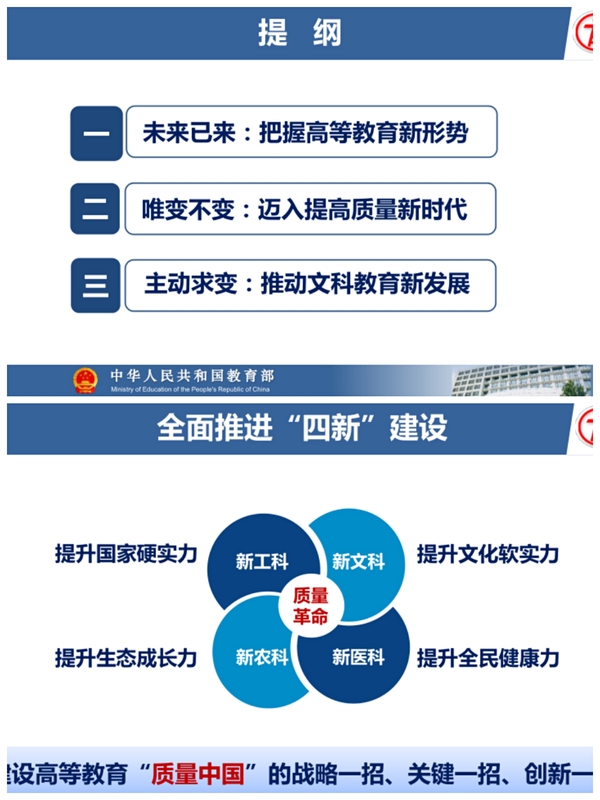 报告强调,文科教育是培养自信心、自豪感、自主性,产生影响力、感召力、塑造力,形成国家民族文化自觉的主战场主阵地主渠道。新文科建设就是推动文科教育创新发展,是培养知中国、爱中国、堪当民族复兴大任的新时代文科人才,培育新时代社会科学家,构建哲学社会科学中国学派,创造光耀时代、光耀世界的中华文化的战略一招、关键一招和创新一招。