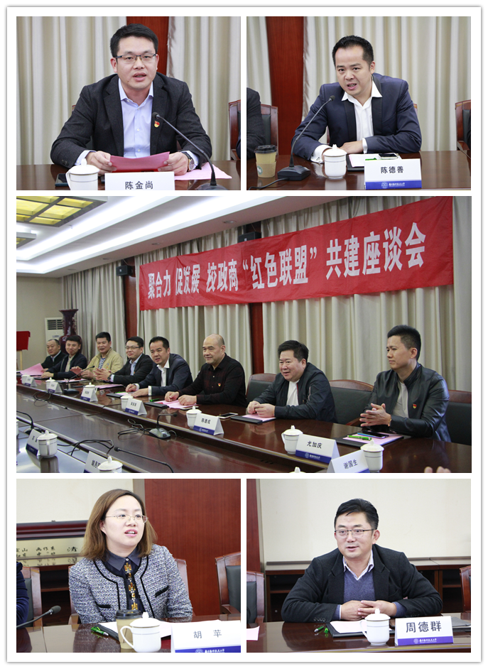 随后双方就深化“红色联盟”共建工作进行了座谈。院党委书记焦宏图首先对晋江统战部和南京晋江商会一行的到来表示欢迎,对五年来“红色联盟”工作开展情况进行了总结。院长周德群表示要继续推动校政商合作,发挥三方优势,推动党建工作往深里走、往实里走,强化党建引领作用,助推政府、商会、学院各项工作高质量开展。晋江市统战部副部长、统战系统党委书记、市侨办主任陈金尚介绍了晋江的基本情况以及“晋江精神”的内涵,肯定了“红色联盟”在人才需求、产学研合作、文化互融、学生实习等方面取得的成绩,欢迎学院继续发挥智力优势,为政府、商会、师生搭建更多交流平台。校组织部、统战部副部长胡苹指出要继续深化“红色联盟”的示范引领作用,凝聚共识、拓宽思路,将党建与业务工作更紧密结合,促进三方工作上新台阶。会上,南京晋江商会会长陈德善、南京晋江商会党支部书记李星辉等与会人员进行了发言交流。
