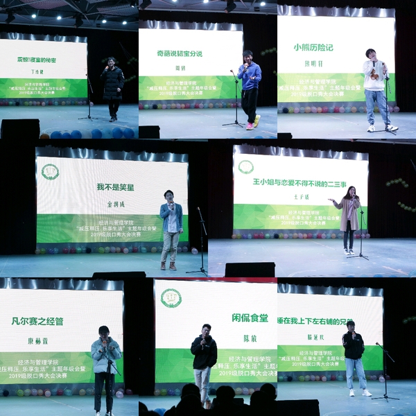 八位选手们以学习科研、恋爱交友、寝室生活为主题,用风趣幽默的“脱口秀”形式讲述了经管学子的精彩生活和奋斗故事,引得同学们的阵阵笑声。