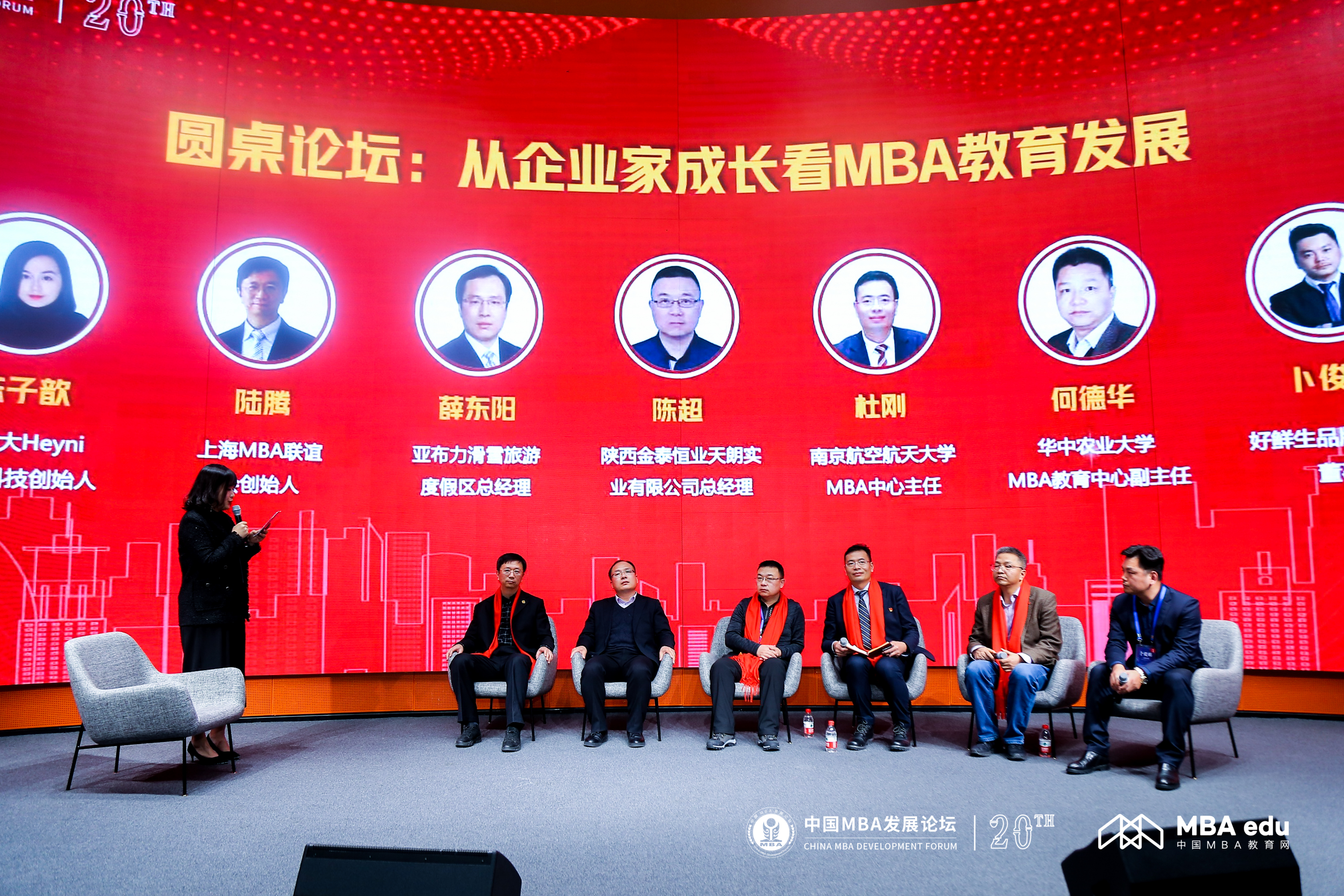 yl23455永利官网MBA中心执行主任杜刚,上海MBA联谊会创始人陆腾,亚布力阳光度假村总经理薛东阳,陕西金泰恒业天朗实业有限公司总经理陈超,华中农业大学MBA教育中心副主任何德华,好鲜生品牌创始人、董事长卜俊鹏围绕“从企业家成长看MBA教育发展”主题进行圆桌分享。MBA共享部落温哥华分站站长、加拿大Heyni中文科技创始人陈子歆主持论坛。