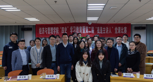 为深入学习贯彻党的十九届五中全会精神,落实将“四史”学习教育融入党支部“三会一课”的明确要求,并进一步加强学生党支部建设。12月25日,经济与管理学院在院楼A0209会议室开展“四史”学习教育暨第二届“我是主讲人”支部党课比赛,院党委书记焦宏图、院党委副书记涂志宏、青年教师代表罗正军、赵亚普、王长波,全体辅导员以及学生党员代表参加了此次活动,活动由辅导员康冲主持。