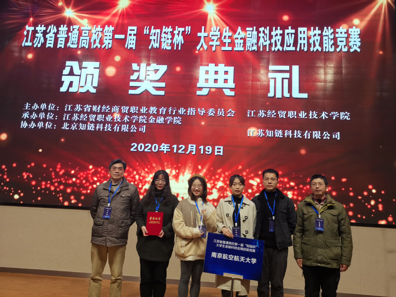 2020年12月19日,江苏省普通高校第一届“知链杯”大学生金融科技应用技能竞赛在江苏经贸职业技术学院举办,本次竞赛由江苏省高等教育学会认定,江苏省教育厅委托江苏省财经商贸职业教育行业指导委员会主办,南航、河海、南农等省内50余院校60团队300师生参赛。通过激烈地角逐,永利官网代表队获得了本次大赛的本科组团体一等奖。