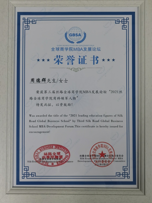 经济与管理学院院长、长江学者特聘教授周德群获得“2021丝路全球商学院商科教育领军人物”