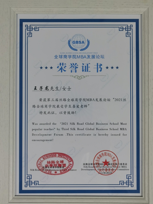 经济与管理学院副院长王子龙获得“2021丝路全球商学院最受喜爱老师奖”