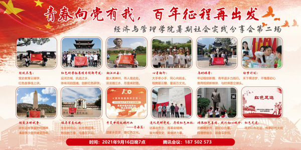 9月16日晚,经济与管理学院“青春向党有我,百年征程再出发”暑期社会实践交流会红色专场顺利开展。来自经管学院的12支献礼建党百年实践团队线上展示了他们的实践成果,践行“请党放心、强国有我”的时代潮音,发出开创未来的青春誓言。产出“微团课”“微党课”10余堂,获得了中国共青团杂志的报道和地方政府的支持与认可。经济与管理学院团委书记刘小杨及实践团队成员参加此次交流会。