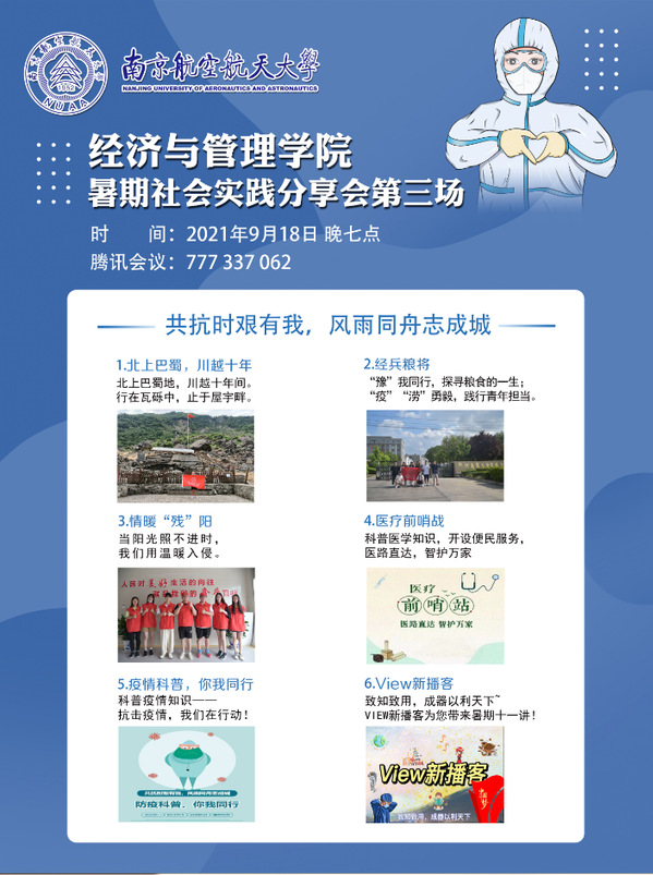 9月18日晚,经济与管理学院“共克时艰有我,风雨同舟志成城”暑期社会实践交流会第三场于线上腾讯会议顺利开展。来自经管学院的6支实践团队分享了他们的实践活动,讲述他们不同形式抗击疫情灾情的经历,他们将“共克时艰”放在心中,“众志成城”付诸行动,呈现出危难时刻、挺身而出的青年形象。经济与管理学院团委书记刘小杨及实践团队成员参加此次交流会。