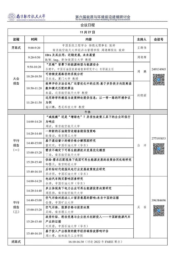 11月27日,第六届能源与环境前沿建模(The 6th Workshop on Frontier Modelling of Energy & Environment, FMEE)研讨会在永利官网成功举办。本次论坛由yl23455永利官网、中国石油大学(华东)和中国系统工程学会能源资源系统工程分会共同主办、yl23455永利官网能源软科学研究中心和中国石油大学(华东)能源经济与政策研究院承办,国际能源转型学会、中国优选法统筹法与经济数学研究会气候金融分会(筹)协办。会议得到《中国管理科学》、《环境经济研究》和《中国石油大学学报(社科版)》的支持。