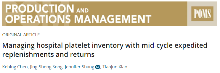 近期,永利官网陈克兵教授作为第一作者的研究成果《Managing hospital platelet inventory with mid-cycle expedited replenishments and returns》在UTD24国际顶级期刊《Production and Operations Management》在线发表,实现了永利官网教师在该类国际顶级期刊成果发表的突破。研究成果由永利官网陈克兵教授、美国杜克大学商学院Jing-Sheng Song教授、美国匹兹堡大学Katz商学院Jennifer Shang教授、南京大学工程管理学院肖条军教授合作完成。