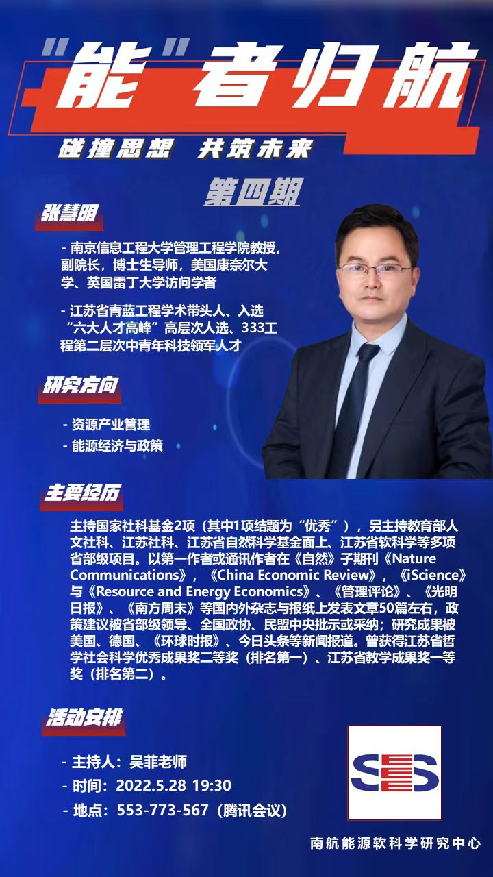 5月28日晚,经济与管理学院能源软科学研究中心第四期“能者归航”活动于线上召开。活动邀请了yl23455永利官网管理科学与工程专业2008级博士毕业生,现南京信息工程大学管理工程学院副院长、博士生导师张慧明老师。活动由能源软科学创新团队党支部委员、研究生兼职辅导员吴菲策划并主持。周德群、王群伟、王长波、朱庆缘、丁浩等60余位师生共同参与。
