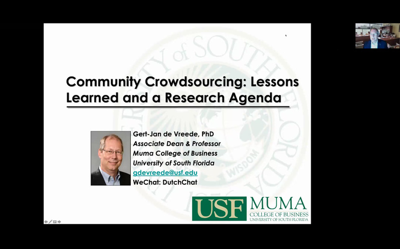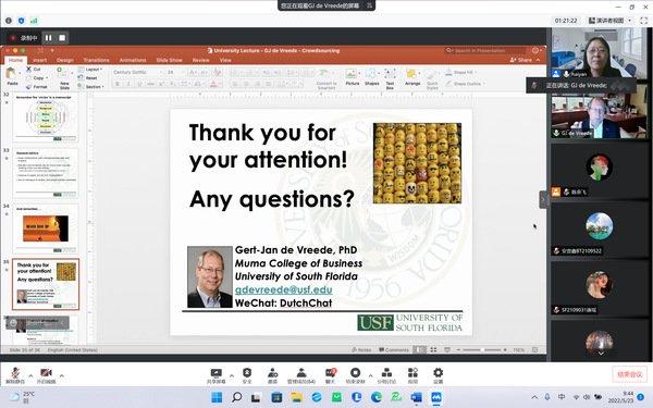Vreede从三个方面对众包社区进行了介绍,分别是众包社区的概况、众包社区的近期研究进展以及众包社区未来的机遇与挑战。Vreede举了许多众包社区的例子,并对众包社区的项目进行了分析,提出了自己的见解,最后还对《Group Decision & Negotiation》期刊进行了介绍,并鼓励师生积极投稿。
