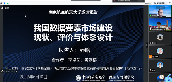 6月10日,中国科学院大学经济与管理学院教授乔晗应经济与管理学院人力资源管理研究所和江苏省人力资源发展研究基地的邀请,在线上(腾讯会议地址:996560802)为永利官网师生作了题为“我国数据要素市场建设现状、评价与体系设计”的精彩学术报告。本次报告由教授胡恩华主持,教师李媛、何昌清、蔡静雯以及博士生和硕士生参加了此次学术报告活动。